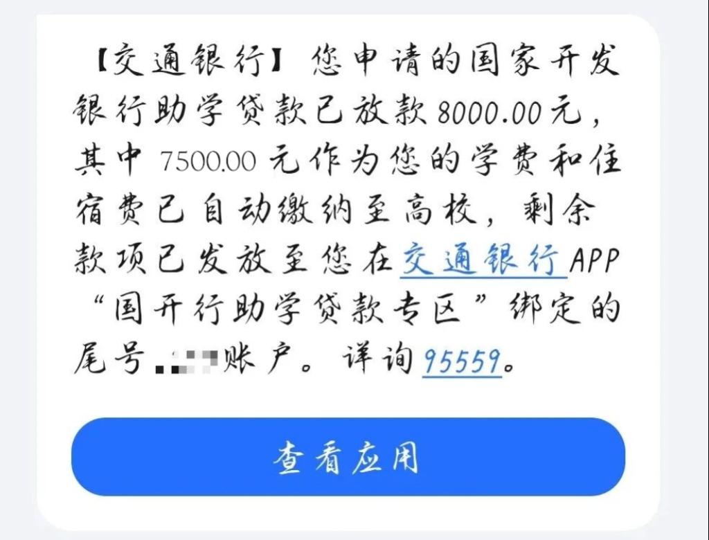 本次短信通知为相关银行放款过程中的例行通知,根据国家开发银行放款流程,银行会将贷款分批汇至学校账户中,预计 11 月底前完成所有贷款放款,部分在国家开发银行贷款的同学收到了类似的短信(如下图)。
